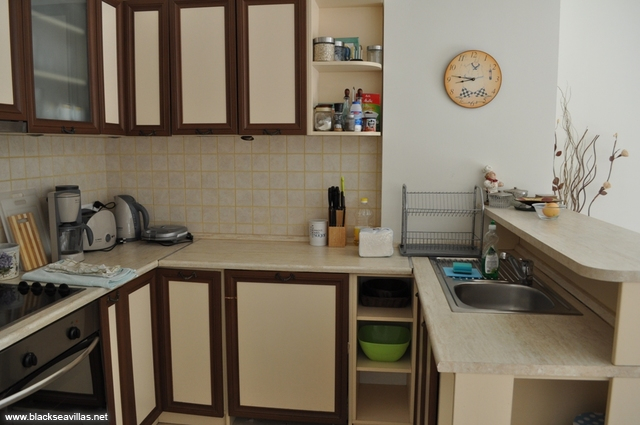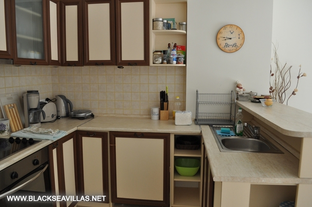 Internal staircase leads to the ground floor, which comprises of a wide living room (about 70 sq.m.) with lounge area with 5 seats and tea table in front of the Plasma TV; coffee and tea sitting area with 4 seats and small table for hearty talks; open-plan kitchen area with enclosed dining table with 8 seats and a separate shower-room with WC and a washing machine. Kitchen is fully equipped with: dishwasher, 4 electric hobs, oven, microwave oven, coffee machine, toaster, el. kettle, extractor, refrigerator combined with a freezer. Separately, on the ground floor there is a en-suite double bedroom located. The enclosed shower-room is fitted with shower, WC, basin with mirror.