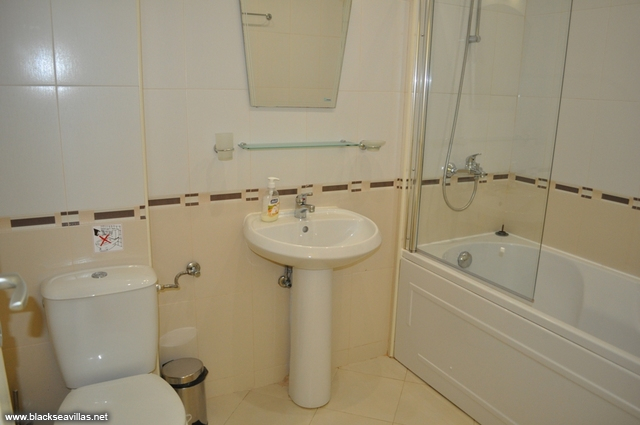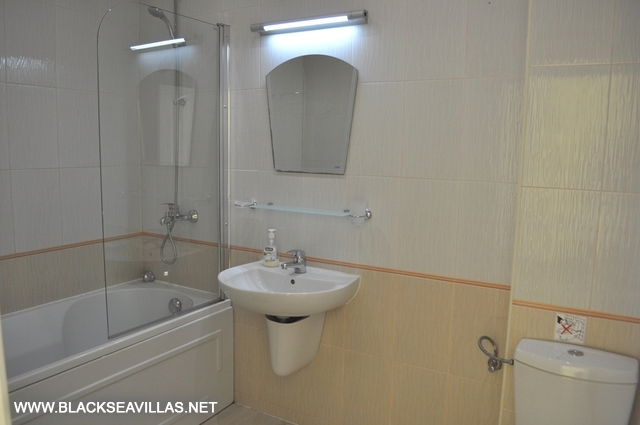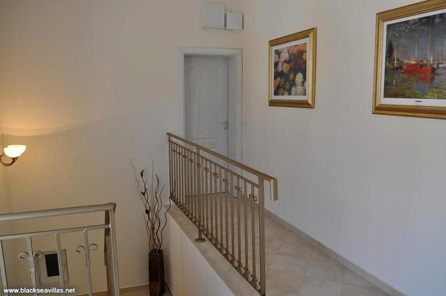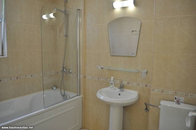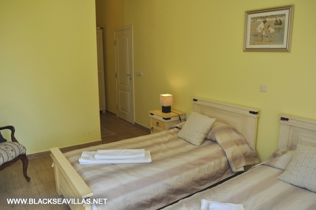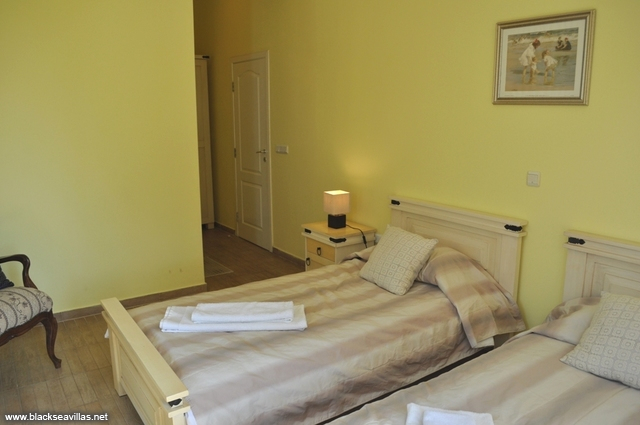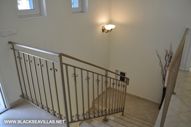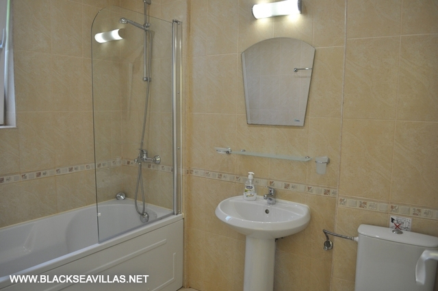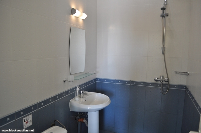 The villa’s entrance opens onto the first floor, where you will find 3 bedrooms – all of them en-suite and with a small balcony each, where the guests would enjoy the sunrise or the sunset over the villa. On this floor one of the bedrooms is equipped with a double bed, while the other two are with 2 single beds each, which can be put together or separate in accordance with your preferences. Further bedroom furniture includes a wardrobe, dresser with mirror, bedside tables with reading lamp. The first floor bathrooms are fitted with a bath tube, WC, basin with mirror.